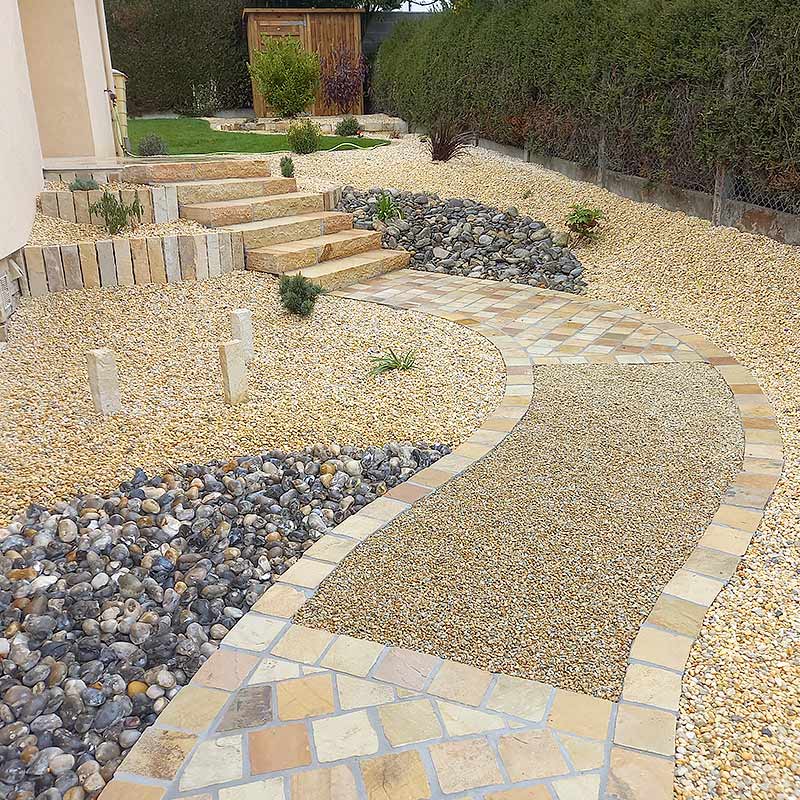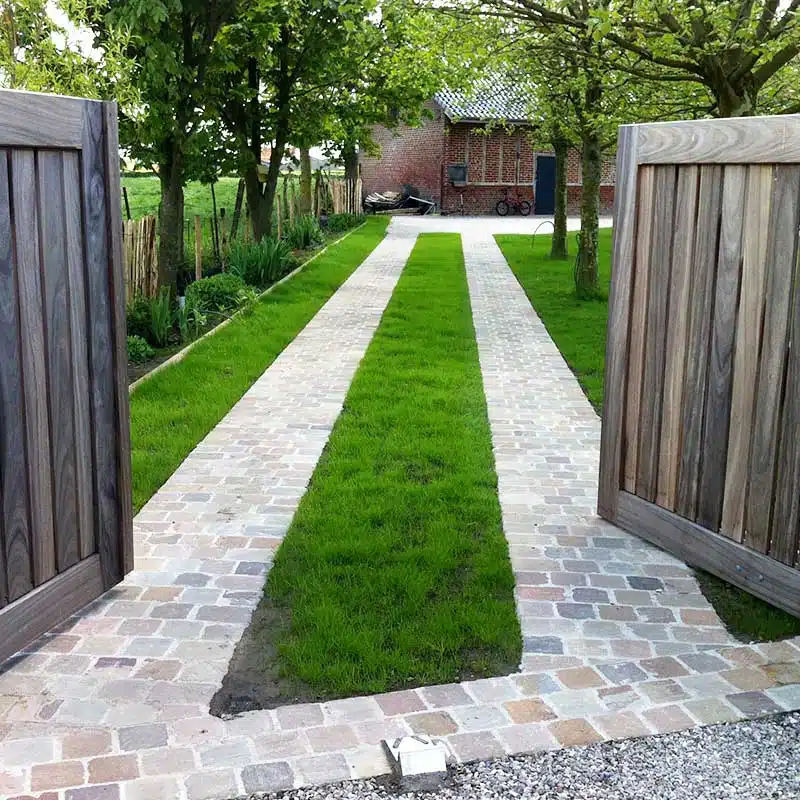 Pour ce type d'usage, les formats suivants sont recommandés : pavés de 15×15 cm à 20×20 cm. L'espacement entre les éléments peut être réduit pour un rendu compact et structuré, ou légèrement élargi pour laisser place à un joint végétalisé qui intègre l'allée dans la végétation environnante. Le grès beige ou le calcaire sablé s'accordent naturellement avec un environnement planté, sans jamais dominer le paysage.