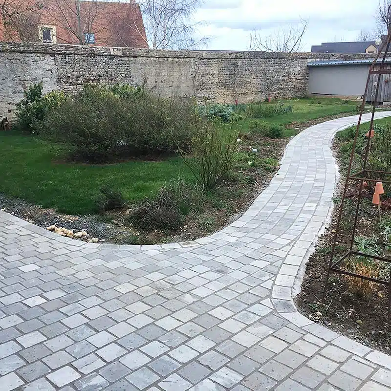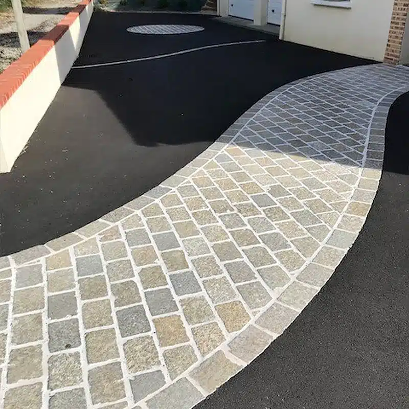 Le scellement des pavés ou l'utilisation d'un mortier de pose adapté peut être requis dans les zones soumises à un trafic intensif ou à des charges lourdes répétées. Contrairement aux pavés en béton ou aux pavés autobloquants, la pierre naturelle ne dispose pas d'un système entre les éléments, ce qui rend la qualité de la pose et de la préparation du sol encore plus déterminante pour assurer la bonne tenue de votre allée dans le temps.