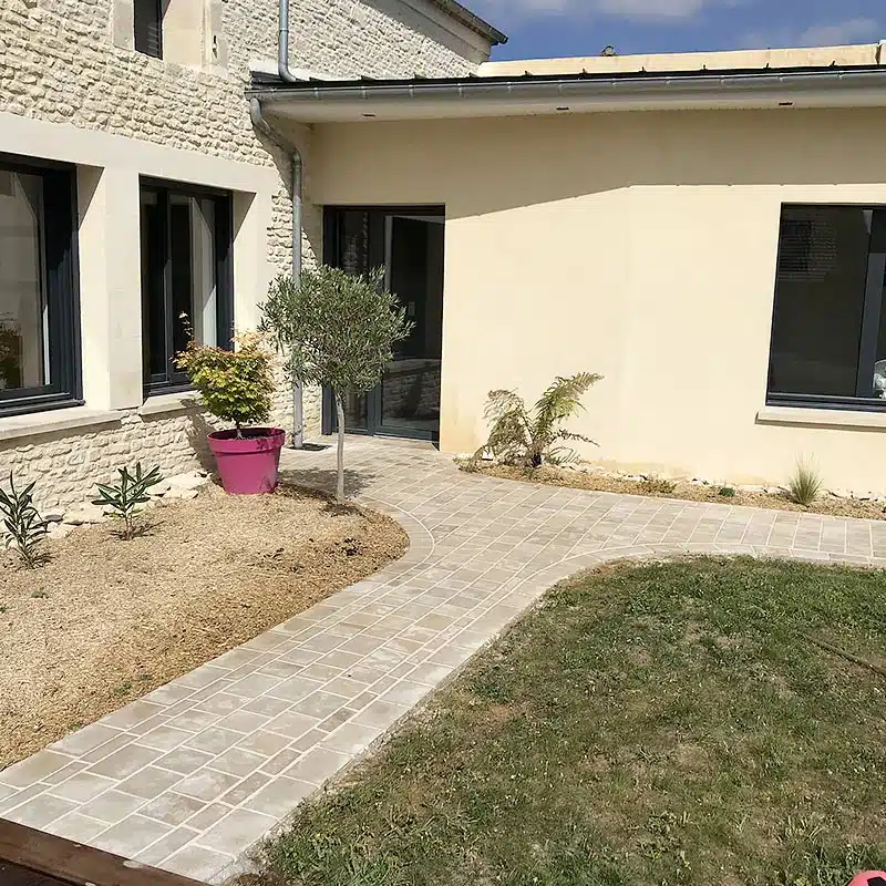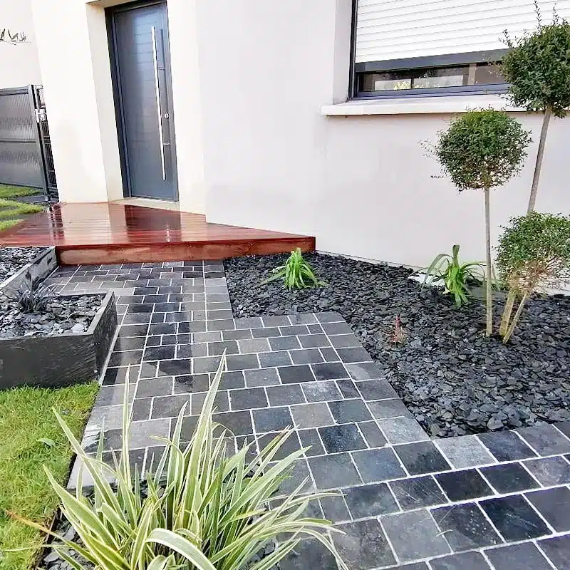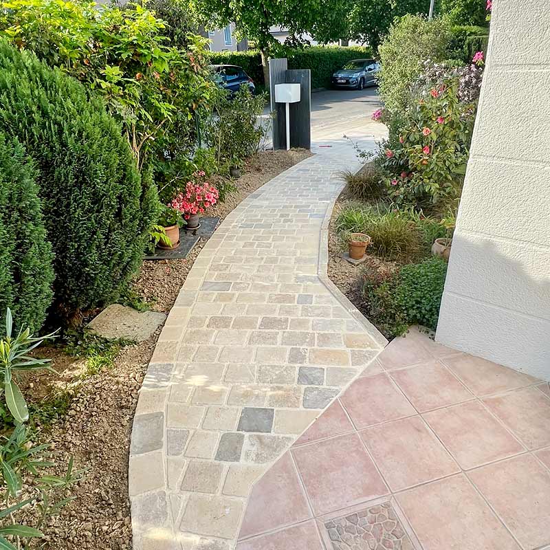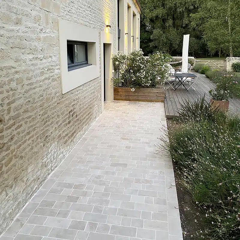 À cela s'ajoute une valeur que les professionnels de l'immobilier connaissent bien : une entrée pavée en pierre naturelle contribue à la valorisation d'un bien de façon significative. Elle signale un soin apporté aux espaces extérieurs, un investissement réfléchi sur la durée. C'est également un atout pour l'aménagement extérieur dans sa globalité, car la pierre naturelle crée une transition harmonieuse et cohérente entre la rue, le jardin et la façade.