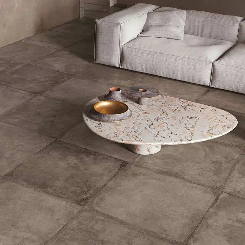Le grès cérame Château Moka se distingue par ses nuances profondes de brun et de beige chaud. Inspiré des sols en pierre patinés par le temps, ce grès cérame effet pierre-béton insuffle une atmosphère chaleureuse et authentique à tous types d’espaces.