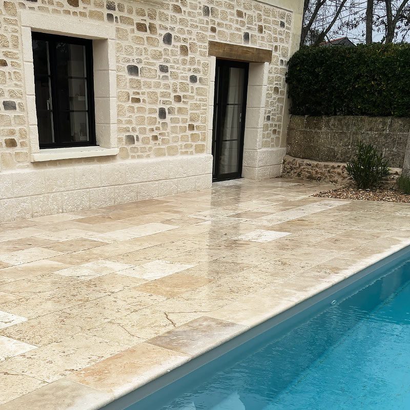 Le travertin 2ème choix sous ses différents formats offre une polyvalence remarquable. Il convient aussi bien pour les espaces intérieurs tels que le salon, la cuisine, que pour les aménagements extérieurs tels que les bords de piscine, la terrasse, ou même les marches d’escalier.