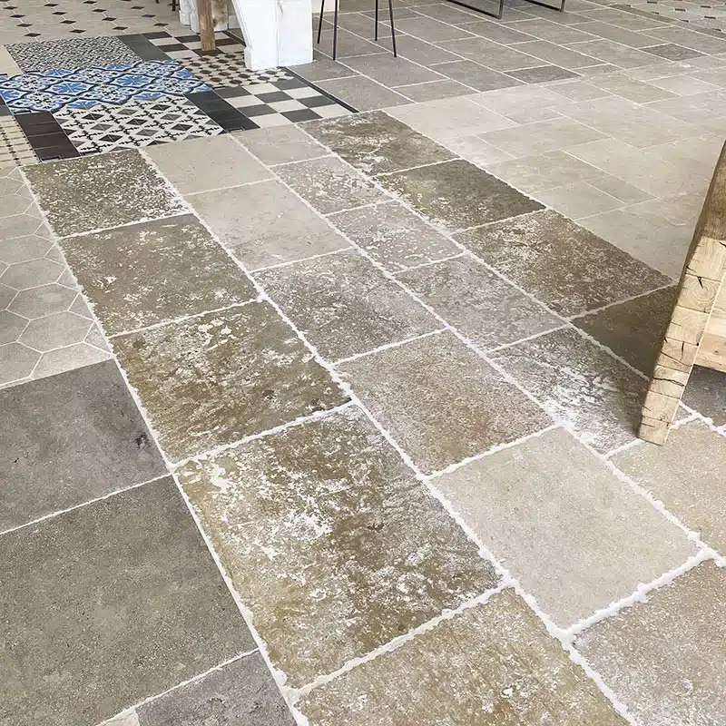 Dallage de réédition en pierre naturelle Française. Le dallage Aurillac possède une finition rustique, ce qui lui donne un aspect authentique. Ses différentes nuances de couleur sont dans des tons beige et marron. Il peut tout à fait être posé en intérieur ou en extérieur, comme dans une pièce de vie par exemple, ainsi que sur une terrasse, dans la continuité de cette pièce.