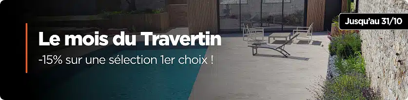 Accueil>Promotions Promotions Ajouter à mes favorisSupprimer de mes favoris Ajouter à mes favoris Jusqu'à - 15% Dallage Travertin Mix 1er choix – vieilli À partir de 27,79€TTC/m232,70€TTC/m2 En stock Ajouter à mes favorisSupprimer de mes favoris Ajouter à mes favoris Jusqu'à - 15% Dallage Travertin Mix 1er choix grand format – vieilli À partir de 51,77€TTC/m2 En stock Ajouter à mes favorisSupprimer de mes favoris Ajouter à mes favoris Jusqu'à - 15% Margelle Travertin Mix 1er choix – vieilli À partir de 16,07€TTC/u18,90€TTC/u En stock Ajouter à mes favorisSupprimer de mes favoris Ajouter à mes favoris - 15% Angle Travertin Mix 1er choix – vieilli 42,76€TTC/u50,30€TTC/u En stock Les prix promotionnels sont directement appliqués à nos produits. Nos promotions ne sont pas cumulables avec l'utilisation de codes promo, à l'exception des codes promo remboursement d'échantillons.